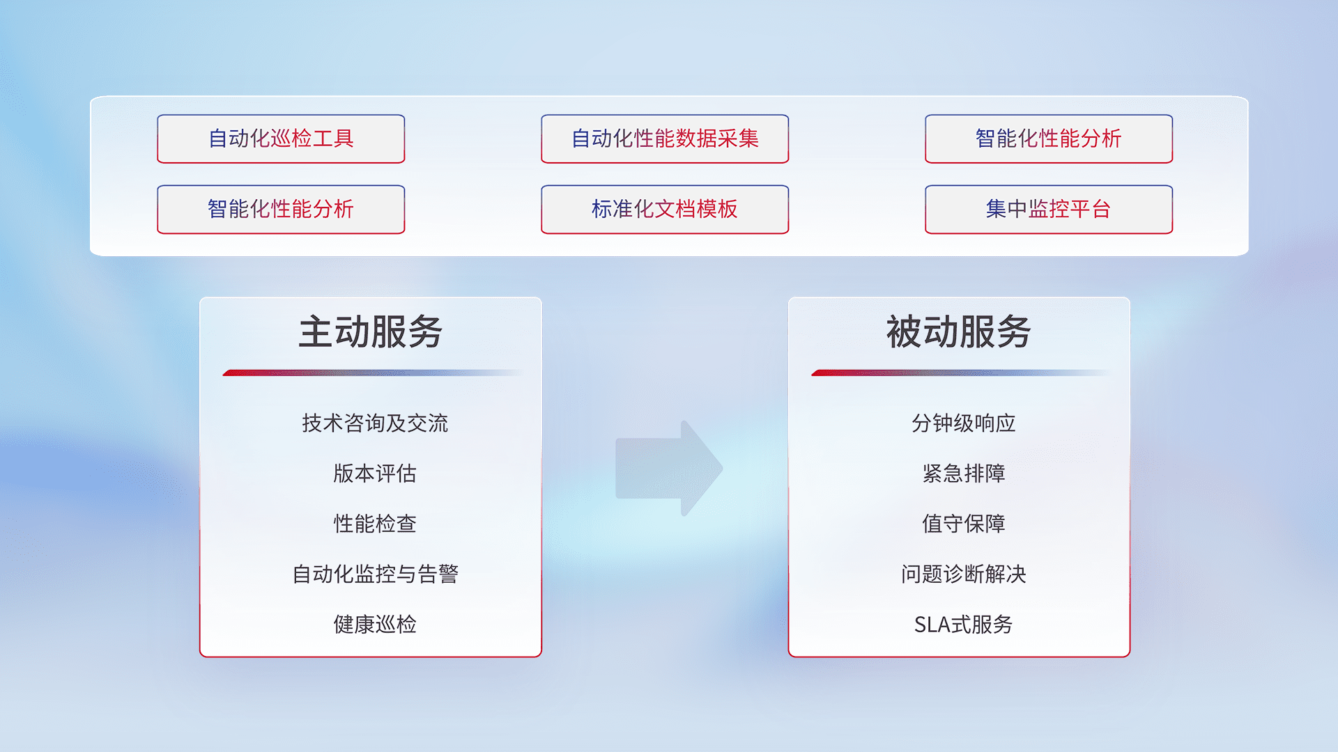 智能化工具和标准化文档,,,保障服务质量,,提供主动服务(包含技术咨询、、、版本评估、、、性能检查、、、、自动化监控与告警、、、、健康巡检)和被动服务包含(分钟级响应、、、、紧急排障、、、值守保障、、、问题诊断解决、、SLA服务)。。。