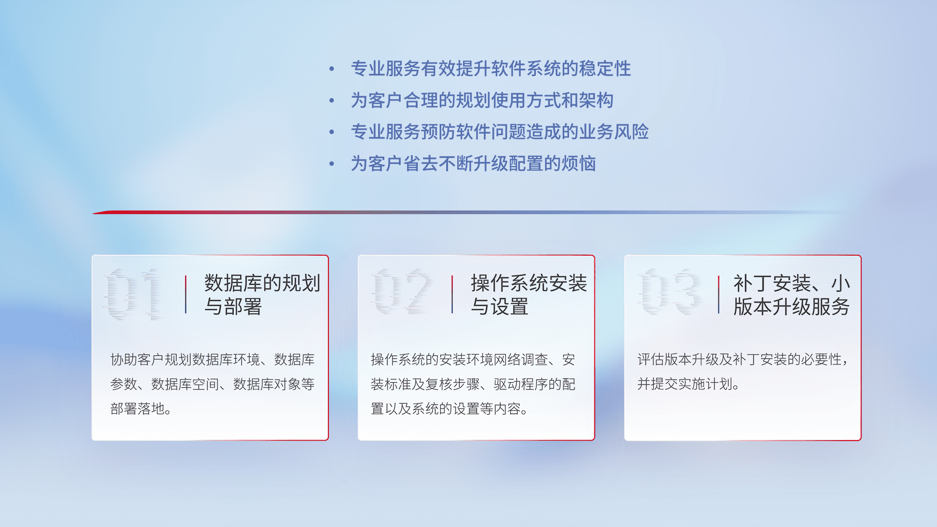 为客户提供软件规模升级、、、、快速部署、、、、按需配置的专业服务,,从数据库的规划与部署到操作系统的安装与设置,,,再到补丁安装和小版本升级提供支持。。。